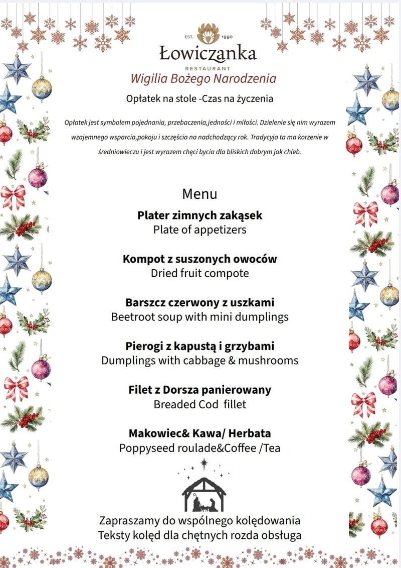 Zapraszamy na wyjątkowy, pełen ciepła Wieczór Wigilijny w Łowiczance – w tradycyjnym, rodzinnym klimacie.